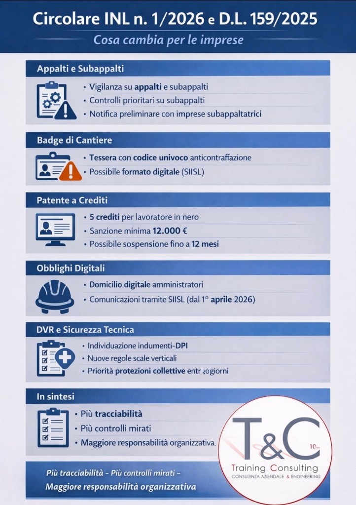 In sintesi La Circolare INL n. 1/2026 chiarisce l’applicazione delle modifiche introdotte dal D.L. 159/2025, rafforzando la vigilanza sugli appalti, rivedendo il sistema della patente a crediti e aggiornando in modo significativo obblighi tecnici, formativi e organizzativi in materia di salute e sicurezza sul lavoro.